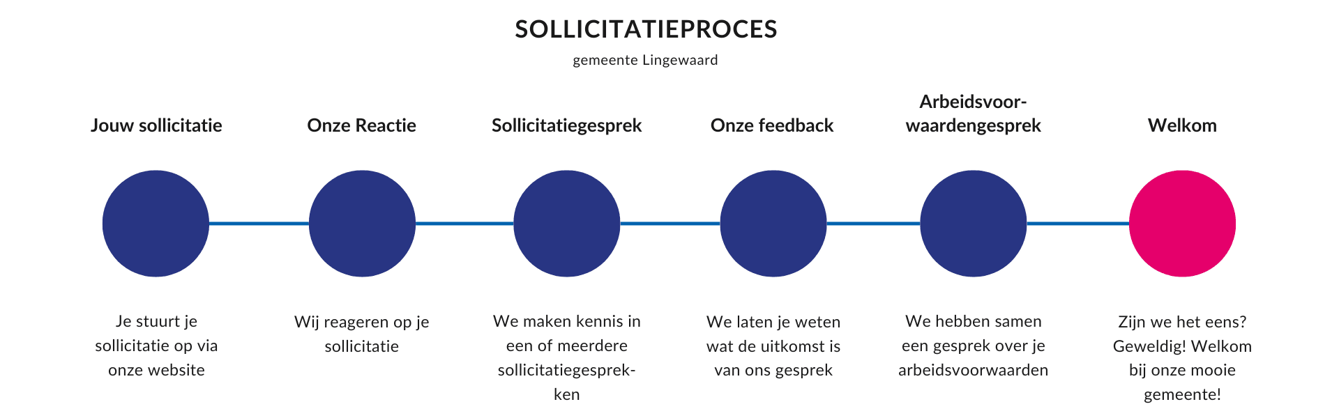 Onze sollicitatieprocedure bestaat uit 6 stappen: van het indienen van jouw sollicitatie tot jouw indiensttreding. Vaak staat in de vacature al beschreven wanneer de gesprekken plaatsvinden: je weet dus vanaf moment één binnen welk tijdspad de procedure loopt.